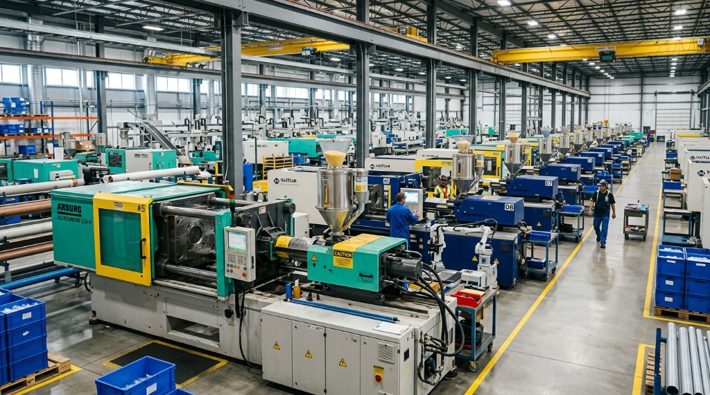 Injection molding machines melt plastic resin and inject it into a mold to produce plastic parts. Clamp tonnage (50–3,000+ tons) and shot size determine capacity. Machines range from small benchtop units to large industrial systems. Brands like Engel, Arburg, Haitian, and Husky are common. Used for automotive, medical, consumer, and industrial plastic parts.